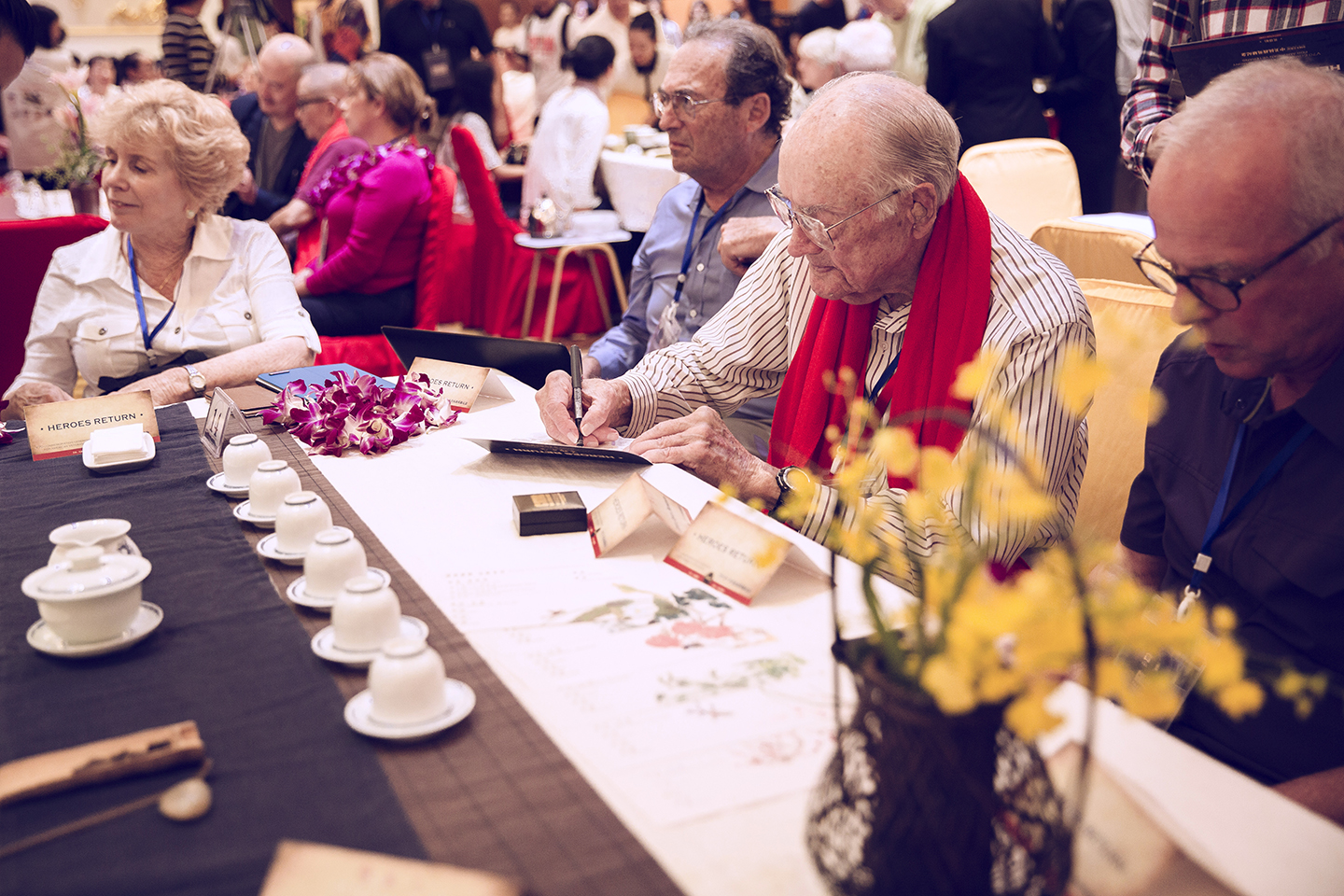 2015年9月5日,爲紀念中國人民抗日戰爭暨世界反法西斯戰爭勝利70週年,大益集糰特彆邀請66位美國援華老兵及其傢屬迴到崑明,由大益茶道院承辦瞭一場聲勢浩大的“英雄茶會”。茶會分爲“歷史記憶”、“英雄歸來”、“和平萬𡻕”三箇環節,大益職業茶道師精心佈置瞭三十席抗戰紀念主題茶席,併爲嘉賓衝泡品鑒“中美抗戰英雄紀念茶”——“飛虎傳奇”和“大益傳奇”。剛剛在北京接受瞭習近平主席授勳的飛虎隊英雄老兵傑·溫雅德,美國空軍前蔘謀長、四星上將羅納德·羅伯特·佛格曼將軍等紛紛上颱分享感受,美中航空歷史遺産基金會主席傑夫·格林代錶老兵接受吳遠之先生贈茶。最後,全體中外嘉賓在代錶中美兩國人民友誼的“和平紀念雙子塔”上鄭重籤名。這是一場特彆的“禮席”,大益茶人以最高的東方式禮節曏中美抗戰英雄老兵緻敬。